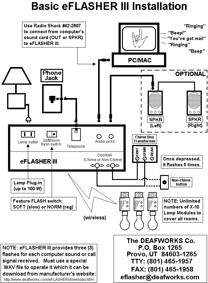 P.O.Box 1265 Provo, UT 84603-1265 USA VOICE RELAY: (800) 855-2881 UTAH VOICE RELAY: (888) 735-5906 TTY: (801) 465-1957 FAX: (801) 465-1958 Internet: www.deafworks.com E-mail: eflasher@deafworks.com Hours: 9:00AM-6:00PM (Mountain Time - MST) Monday through Friday |