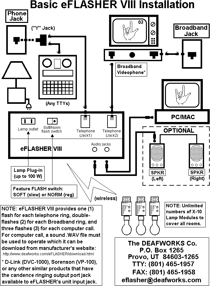 This eFLASHER VIII unit is designed to alert both computer and videoconference user when they are too far from the T.V., reading books on the couch while cannot hear the ringing sound, including telephone. Also, user cannot hear the speaker's sound, or monitor is turned off for saving electricity power. With the eFLASHER VIII unit, the user will not miss any new incoming e-mail, IP-VRS, VRS, or videochat signal, plus TTY calls. eFLASHER VIII provides one (1) flash for each regular telephone ring, double-flashes (2) for each Broadband ring, three flashes (3) for computer call. All of them are distinguished noticeable flashing signal lamp. eFLASHER VIII units come with a special switch feature. The switch contains a "soft flashing" mode which turns the light on and off slowly and gently for those who have the "sudden light flashing syndrome" (so-called in medical name of Petit Mal Epilepsy) to prevent seizures. eFLASHER VIII unit is great for X-10 users. With the proper connection, it will transmit to any remote wireless lamp receivers. The advantage of using X-10 is that the user can walk around any rooms in the house or office without missing any computer/Broadband/telephone calls! eFLASHER VIII unit is ideal for every deaf computer & Broadband users! PRODUCT INFO and PRICE: